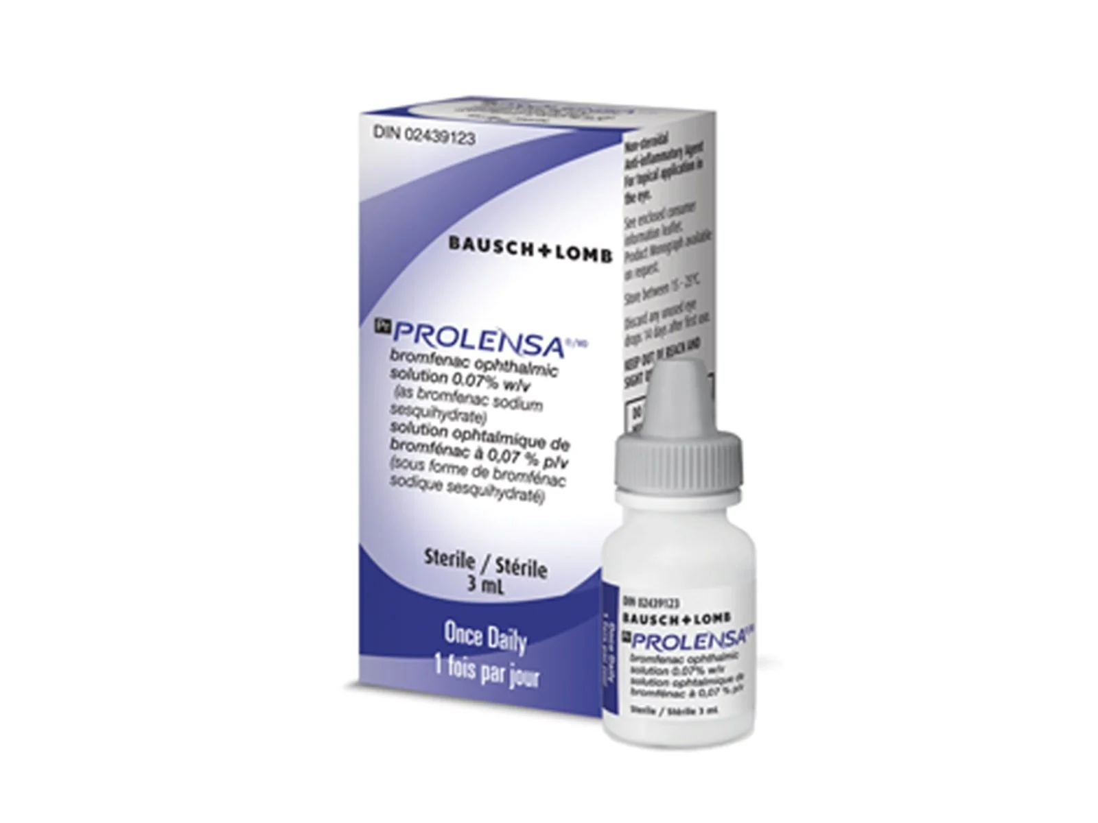 Prolensa (bromfenac ophthalmic solution 0.07%) is a nonsteroidal anti-inflammatory drug (NSAID) that works by targeting and inhibiting the cyclooxygenase (COX) enzymes in the body. These enzymes, COX-1 and COX-2, play a key role in producing prostaglandins, which are substances that cause inflammation, pain, and swelling. After eye surgery, such as cataract removal, prostaglandins are released in response to the trauma, leading to inflammation and discomfort.